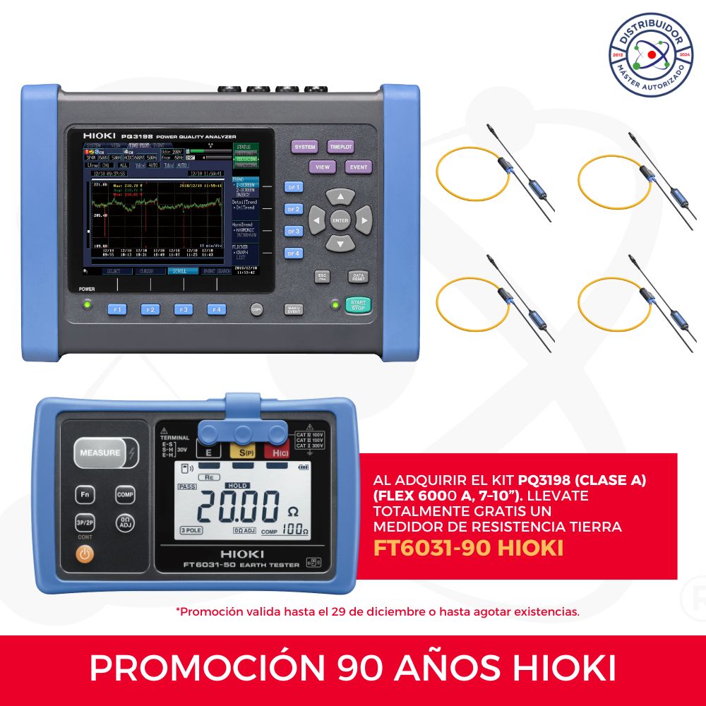 Al adquirir un PQ3198 Kit o un PQ3100 Kit, recibirás totalmente gratis el Medidor de Resistencia a Tierra HIOKI FT6031-90, un instrumento portátil, robusto y preciso, diseñado para evaluar la efectividad de los sistemas de puesta a tierra, protegiendo personas y equipos frente a fallas eléctricas.